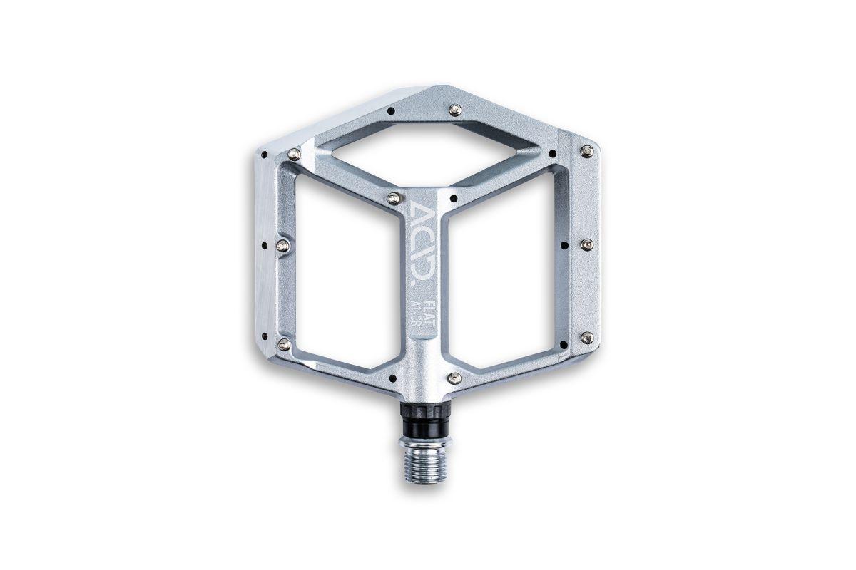 leichtes Flat-Pedal, CNC-veredelter Aluminiumkörper und CrMo Achse, angefaste Kanten für erhöhte Bodenfreiheit in Kurven, große Standfläche, extrem flache Bauweise, neun austauschbare Pins pro Seite, gedichtetes Patronengleitlager und zwei gedichtete Industrielager