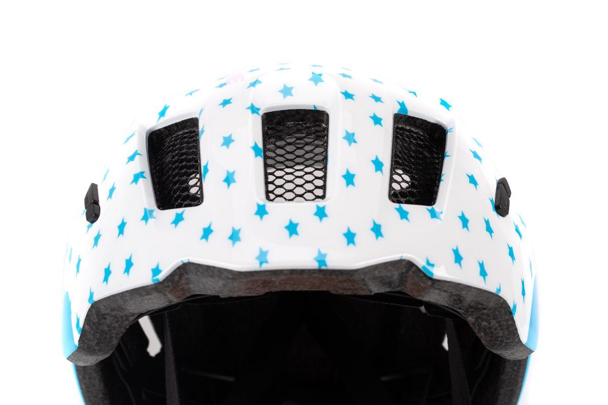 Kinder- und Jugend-Helm, 11 große Belüftungsöffnungen, Insektennetze im Frontbereich, einhändig bedienbares SNAP 360 Fit System für eine optimale Passform, In-Mould Konstruktion, Flat Divider für die bestmögliche Gurtbandführung, herausnehmbare und waschbare Polster, weitere Polsterstärke erhältlich, X-Lock Befestigungssystem, Licht nachrüstbar, Rastersteckschloss mit Kinnpolster, Natural Fit Konzept, glänzendes Finish