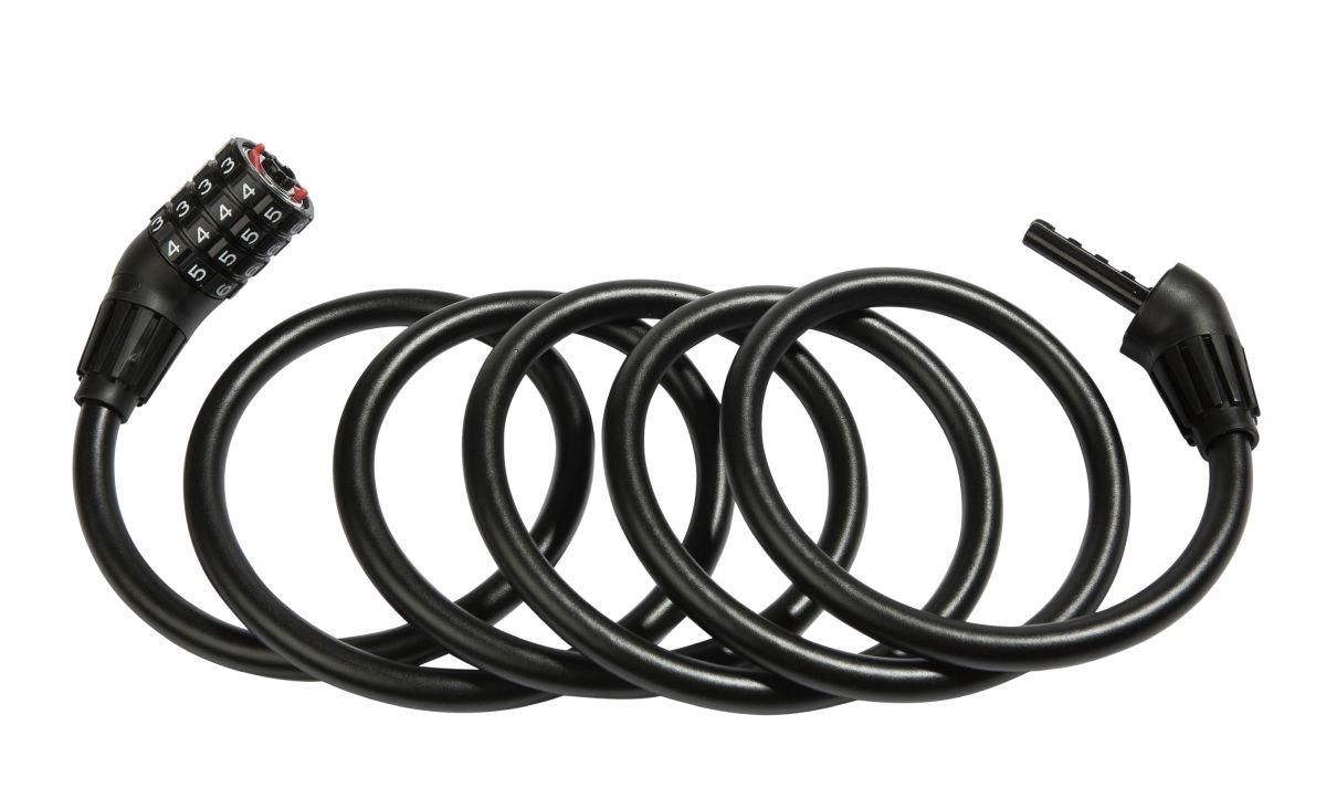extra sicheres Spiralkabelschloss, Kabel und Schlosskörper korrosionsgeschützt, Kunststoffcover schützen den Rahmen vor Kratzern, geprüft auf mechanische Festigkeit, abnutzungsresistent, schadstoffarm zertifiziert, frei einstellbarer Zahlencode
