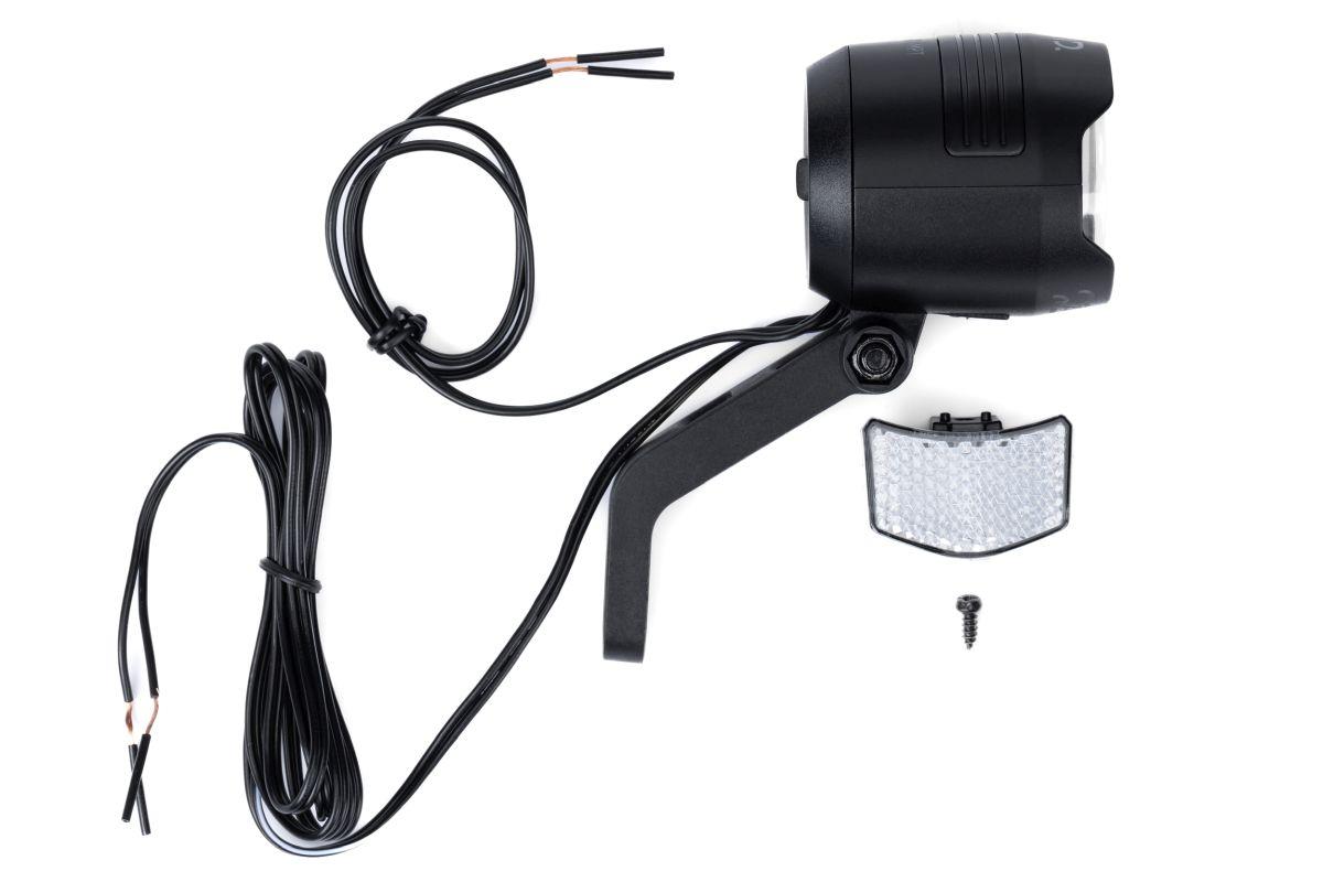 LED-Frontlicht für Dynamo, StVZO zugelassen, 50 Lux, Eingangsspannung 6V (AC), Nennleistung 2,4 W, 80 cm Lichtkabel zu Dynamo, 40 cm Lichtkabel zu Rücklicht, inkl. Gabelhalterung Universal HPP, inkl. K-Reflektor, Standlichtfunktion, Auto-On Funktion, Schutzklasse IPX5