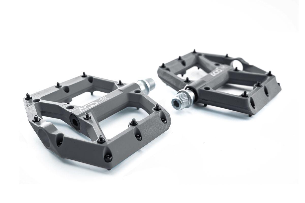 leichtes Flat-Pedal, Nylon-verstärkter-Kunststoff-Körper und CrMo Achse, angefaste Kanten für erhöhte Bodenfreiheit in Kurven, große Standfläche, extrem flache Bauweise, neun austauschbare und einstellbare Pins pro Seite, gedichtete Industrielager