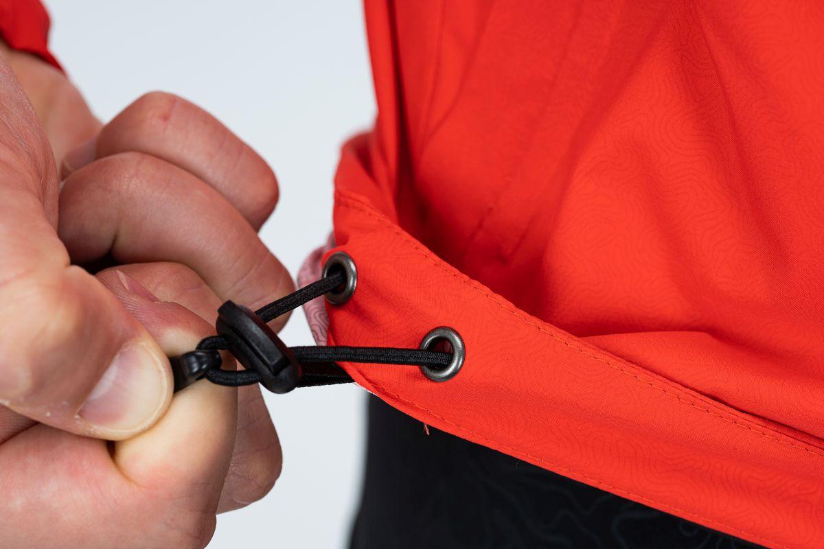 dauerhaft wasserabweisendes 2,5-Lagen-Funktionsmaterial, durchgehender wasserabweisender Frontreißverschluss, getapte Nähte, Saum verstellbar durch integrierten Kordelzug, Aussparung am Saum um Ballon-Effekt bei eng gezogenem Saum zu vermeiden, verstellbare Kapuze mit zusätzlichem Schirm, Kapuze eignet sich zum Tragen unter dem Helm, Seitentaschen mit verdecktem Reißverschluss, Perforation zur Ventilation unter den Armen, elastischer Ärmelsaum, reflektierende Elemente